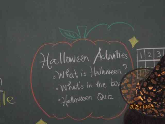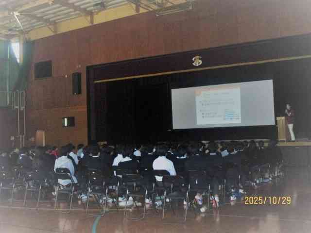 いのちを考える月間の取り組みの一つとして、10月~11月、各学年、次の授業を行います。 2年生、がん教育講演会(本日10/29)(写真上) 3年生、性教育講演会(10/28) 1年生、薬物乱用防止教室(11/26) HAPPY Halloween(写真下) 2年生の英語の授業(ALT)です。 今日は、2年生の3クラスともALTとの授業でした。タイムリーなアクティビティーでした。